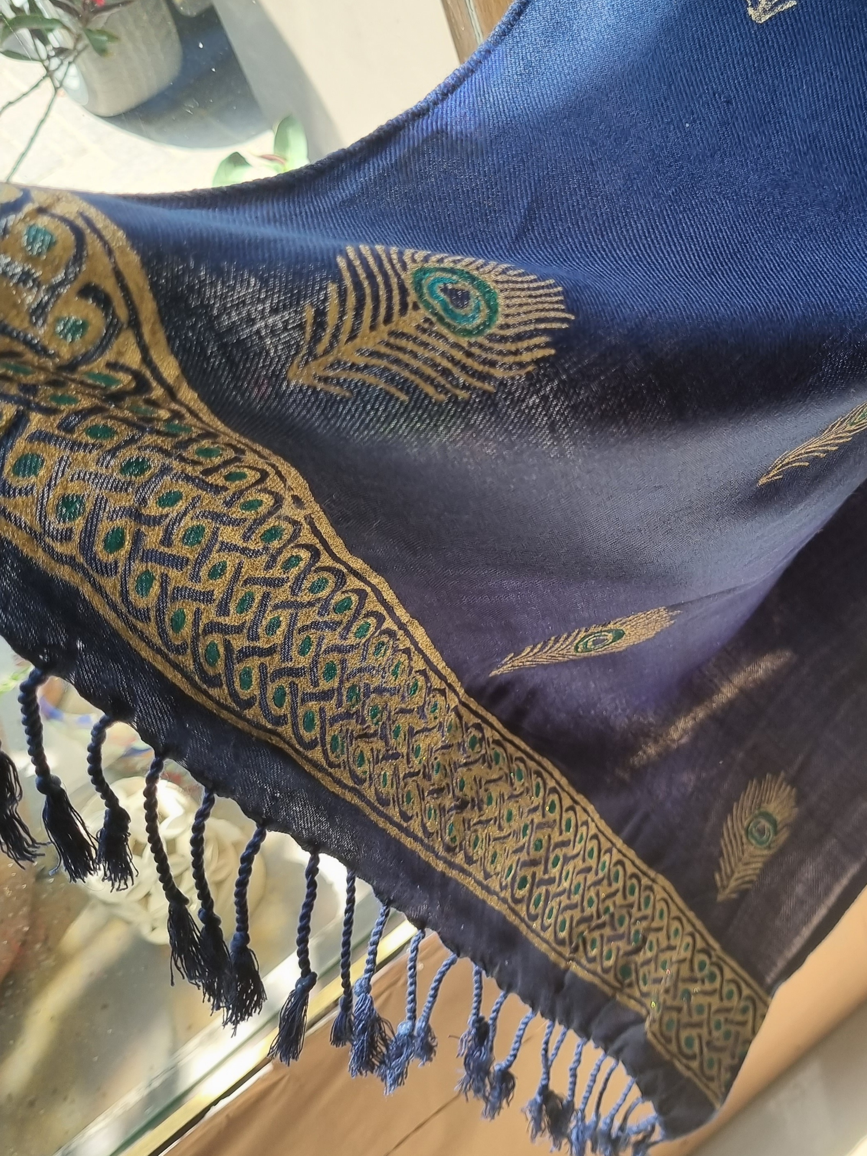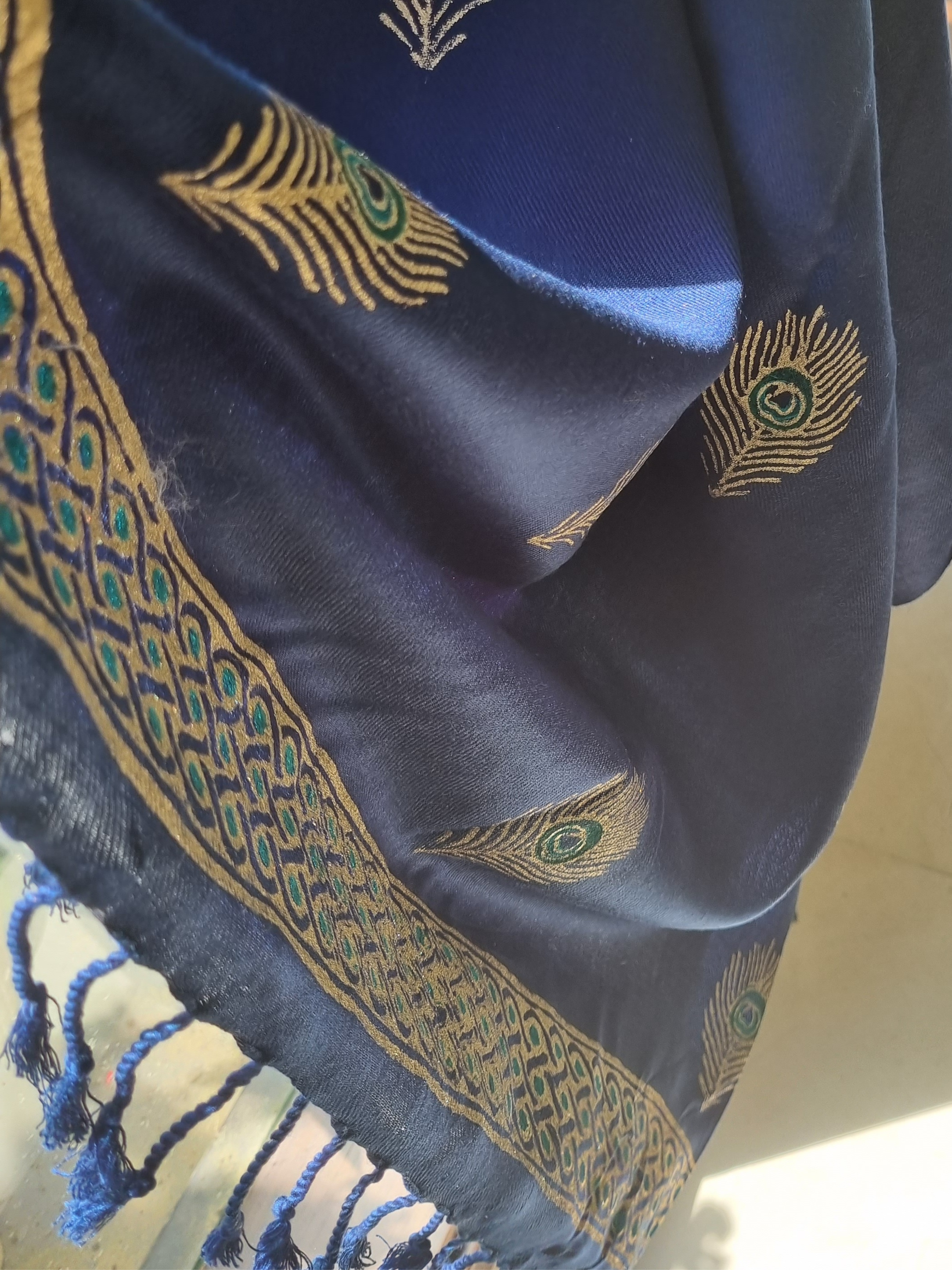 Navy Blue Woolen Scarf with Block Printed Peacock Feather Motifs and Border